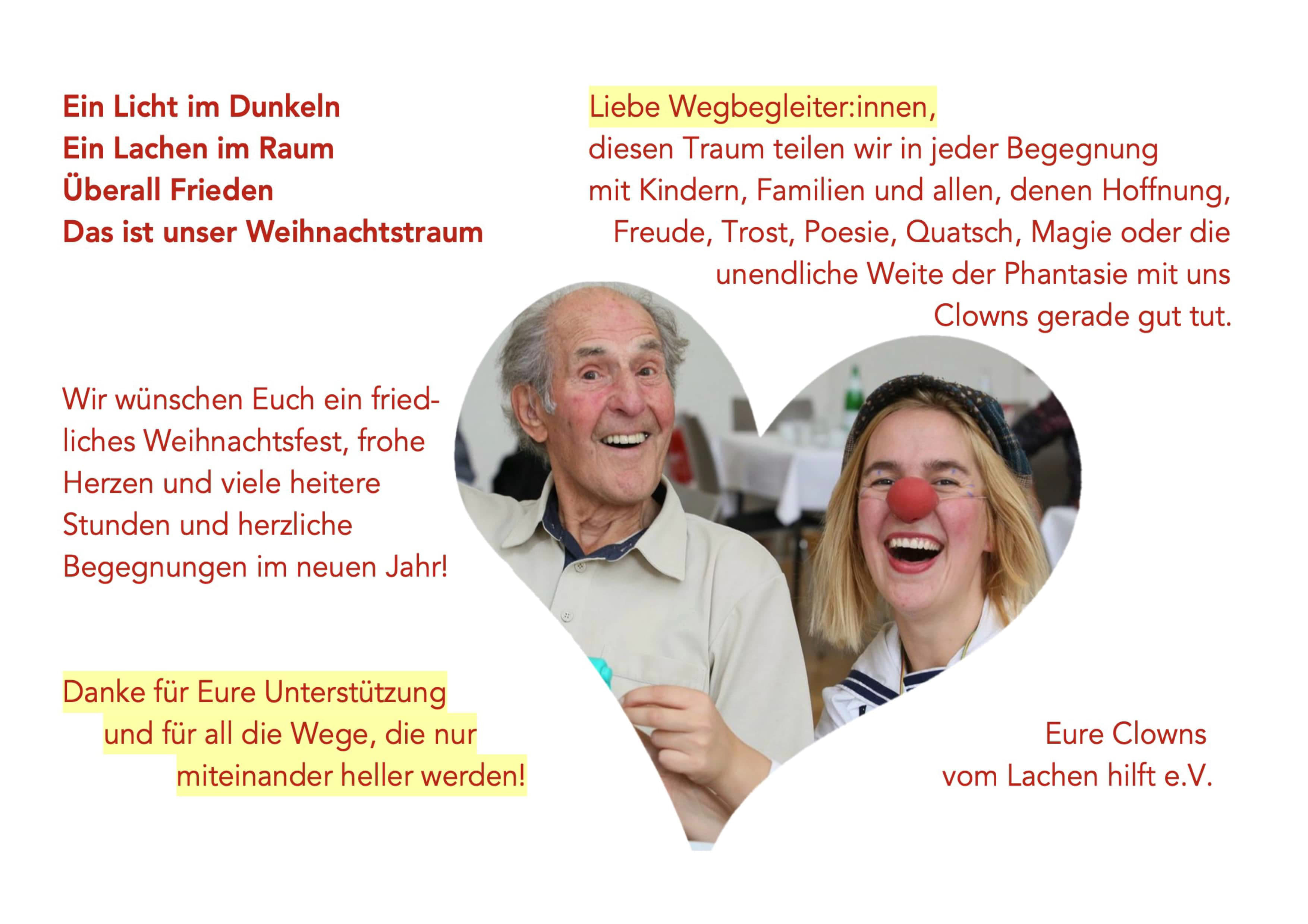 Mit unserem diesjährigen Weihnachtsgruß möchten wir Euch danken – für all die Begegnungen, das Vertrauen und die Unterstützung, die unsere Arbeit als Klinikclowns möglich machen.